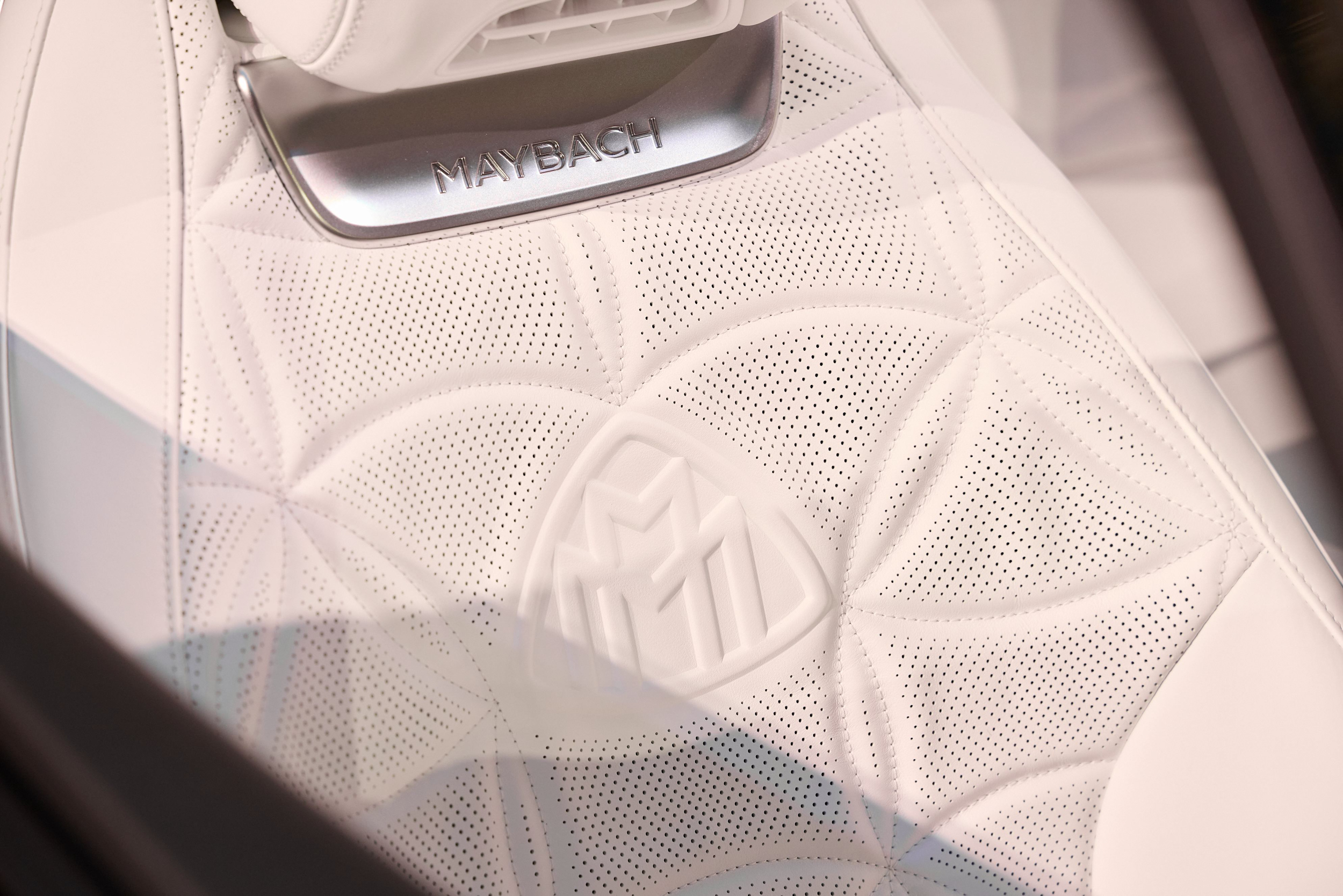 座艙設計雙色鋪陳,上半部於腰線之上採黑色皮革包覆;下半部則為MANUFAKTUR 頂級Nappa 真皮-水晶白,呈現強烈對比之美,盡顯 Maybach 一貫的華貴與高雅。車內大面積採用MANUFAKTUR 水晶白 Nappa 真皮內裝,覆蓋門板、中控台及座椅,營造出通透、優雅的空間,及打造溫暖、舒適、放鬆的氛圍。座椅採用全新的花卉圖騰(Flower Pattern)車縫線設計,成為 Maybach 內裝美學的精髓。座椅背面則為鍍鉻材質,搭配 Maybach 經典圖騰,每一寸細節都值得細細品味。