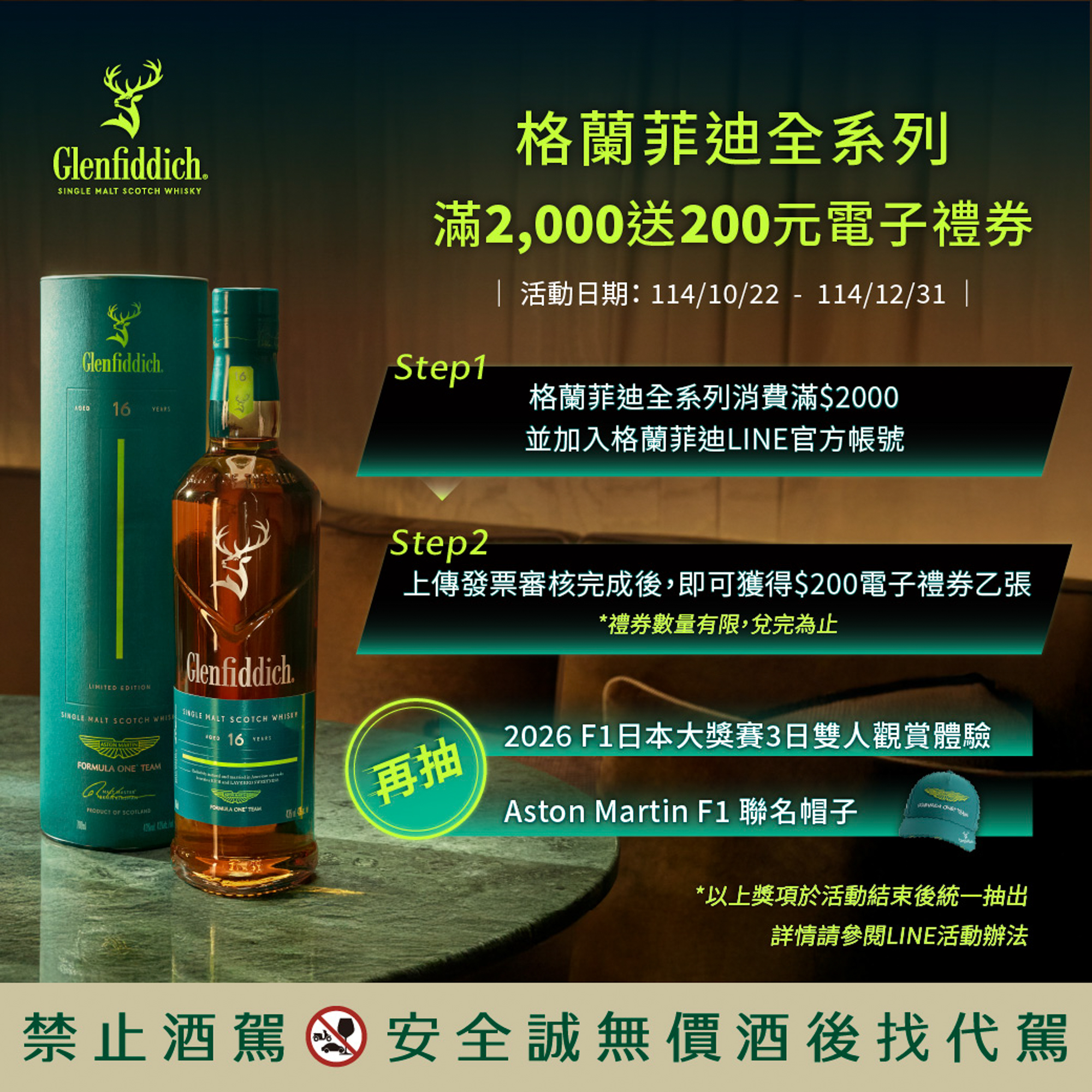 格蘭菲迪更將熱潮擴展至全台指定合作通路,10/22至12/31綁定官方LINE帳號並購買格蘭菲迪全系列商品滿NT$2,000,即可獲得NT$200電子禮券(數量有限,兌完為止);完成發票登錄者,更有機會抽中「Aston Martin F1聯名帽子」,以及終極大獎「2026 F1日本大獎賽3日雙人觀賞體驗」。格蘭菲迪邀請全台消費者一同沉浸於速度與品味交織的盛宴,讓每一次舉杯,都是邁向非凡旅程的起點。