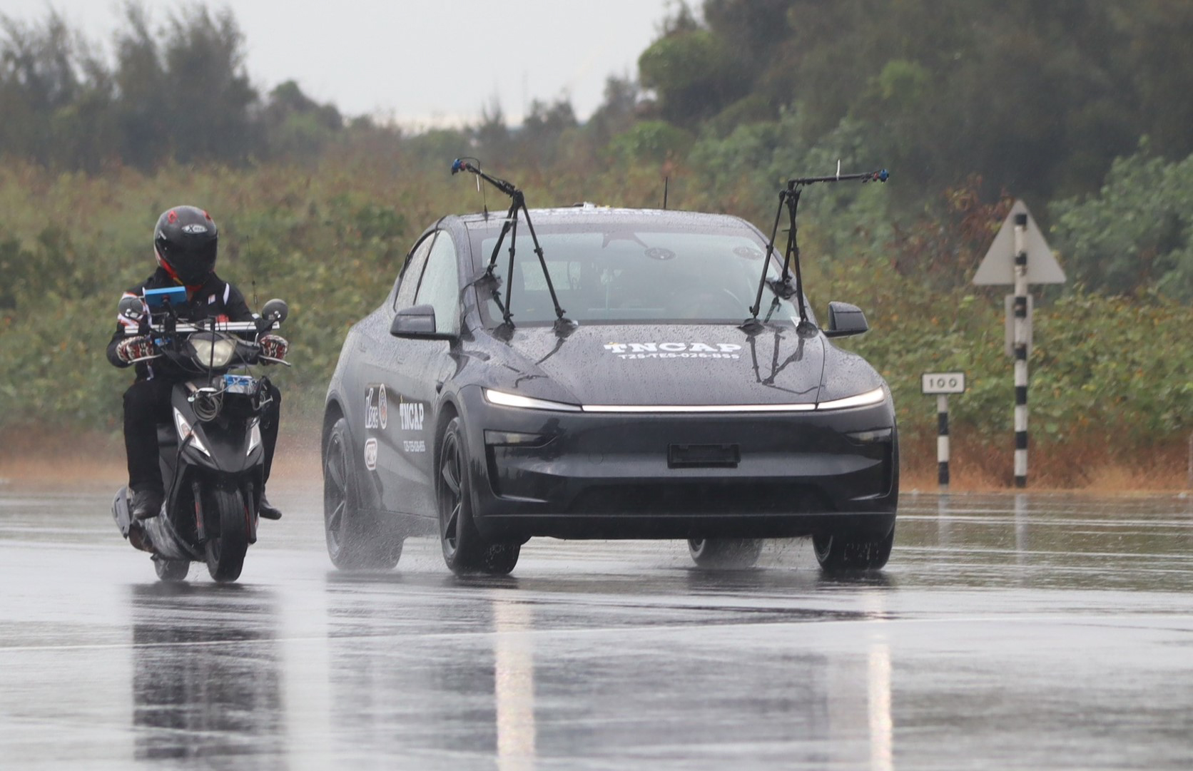 - 盲點輔助系統(BSD)試驗:模擬機車行駛至受驗車輛側方時,系統偵測機車並提供駕駛警示提醒,期能降低車輛變換車道時的側方碰撞風險。