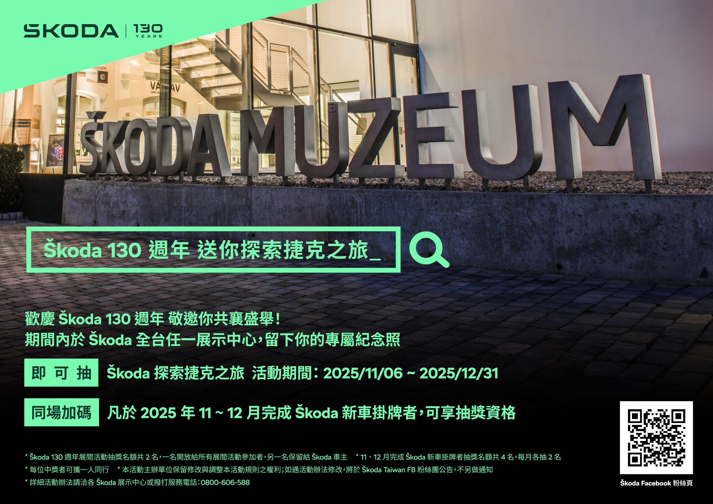 於活動期間至全台 Škoda 授權展示中心參加「130 週年展間活動」,完成指定拍照任務即可獲得抽獎資格。