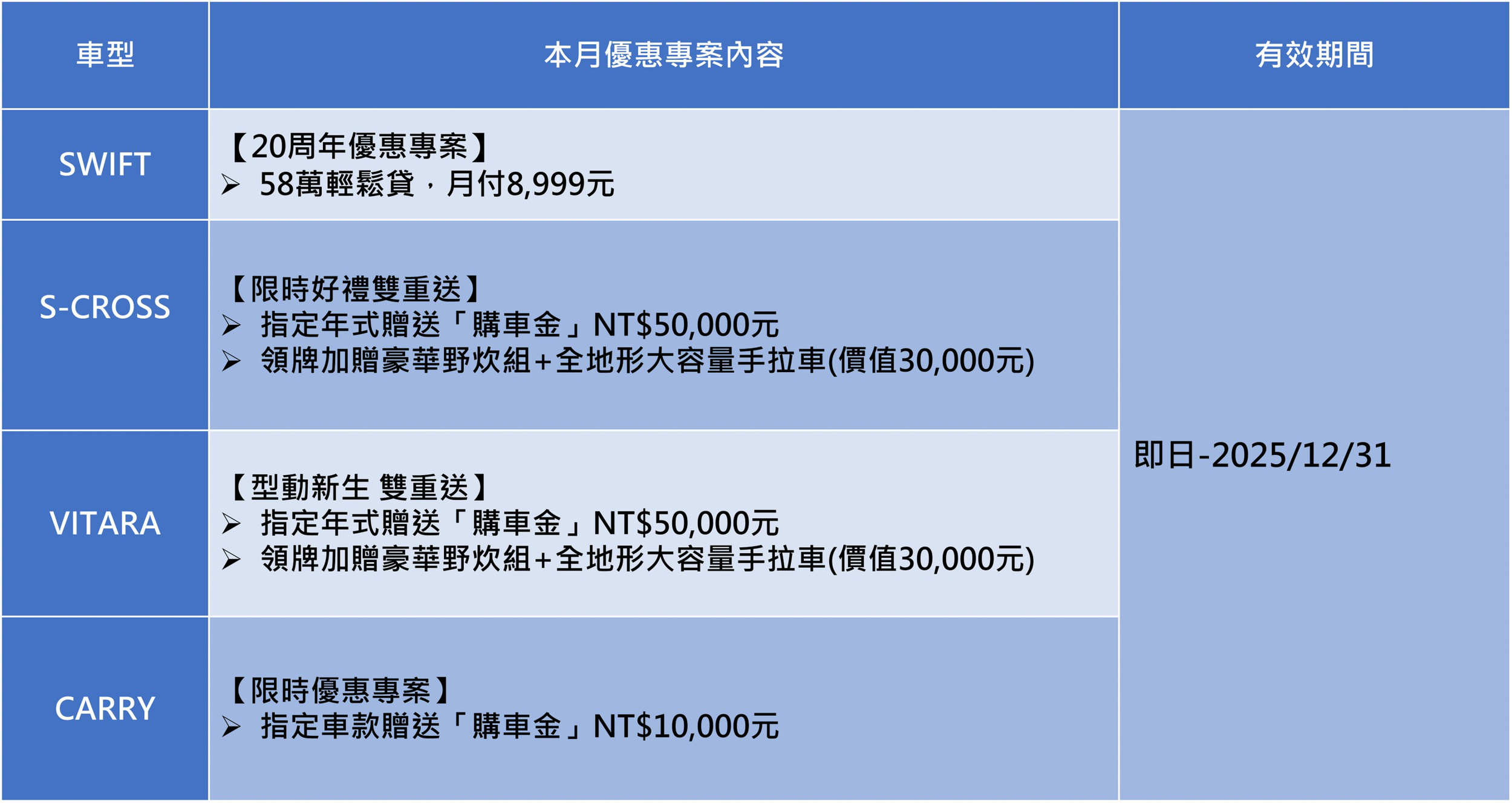 TAIWAN SUZUKI特別推出「20周年優惠專案」,讓您以輕鬆月付8,999元的超值優惠,輕鬆入主暢銷神車SWIFT,無壓力享受高效節能的駕馭樂趣。