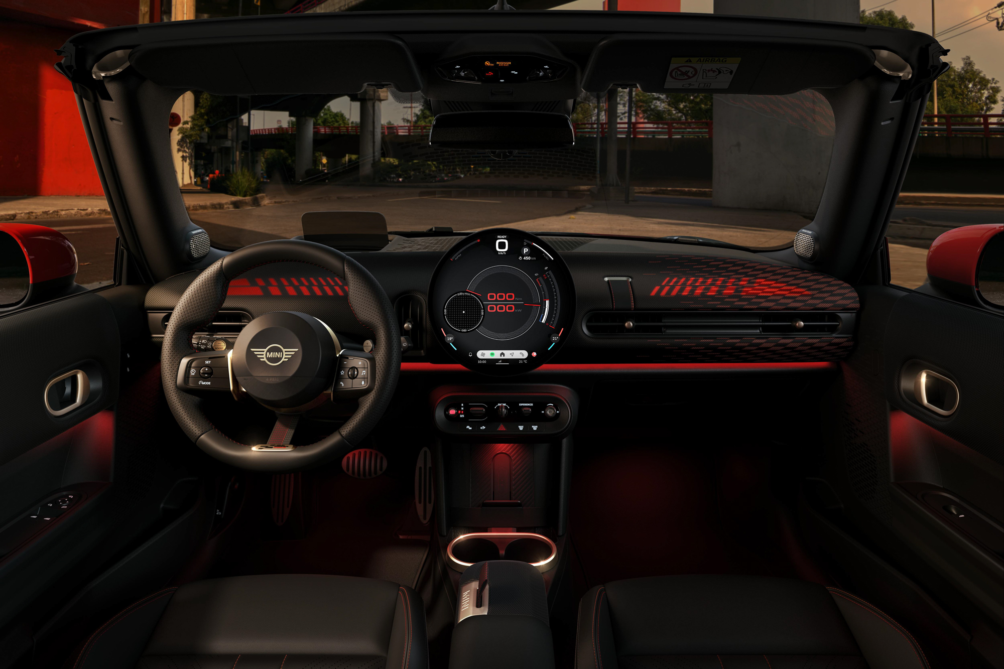 全新MINI John Cooper Works Cabrio內裝搭載JCW專屬運動座椅提供卓越支撐;JCW跑車式打孔Vescin方向盤搭配換檔撥片,讓駕駛隨心掌控加速與換檔節奏。標配harman/kardon高傳真音響系統,雙色織布與Vescin全素皮革內裝、紅色縫線與JCW專屬環景燈光,打造兼具精緻質感與熱血動感的座艙。