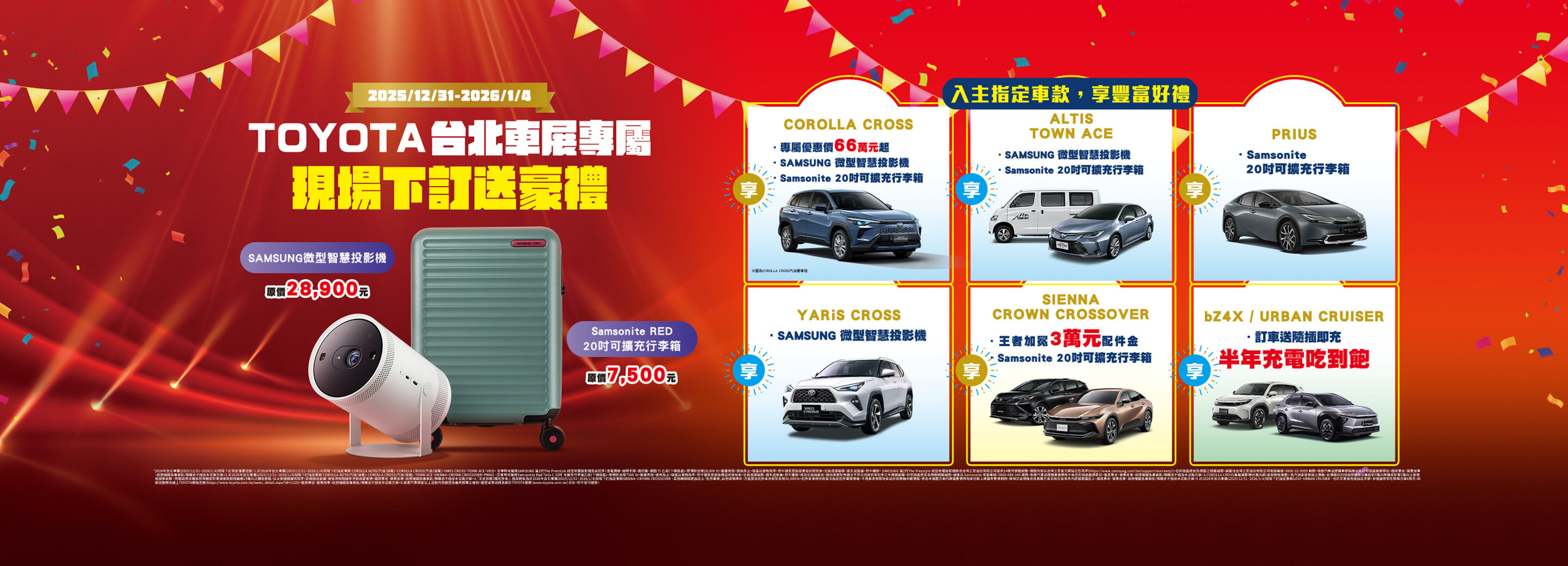 此外,Toyota亦推出台北車展專屬「現場下訂送豪禮」限定活動,入主指定車款贈送SAMSUNG 第2代The Freestyle 微型智慧投影機(原價28,900元) 或 Samsonite 20吋可擴充行李箱(原價 7,500 元),好禮數量有限,送完為止。同時,於車展現場下訂 SIENNA 與 CROWN CROSSOVER,可再享「王者加冕」3 萬元尊榮配件金;下訂純電車款 bZ4X 與 Urban Cruiser則享專屬「隨插即充」半年充電吃到飽方案。