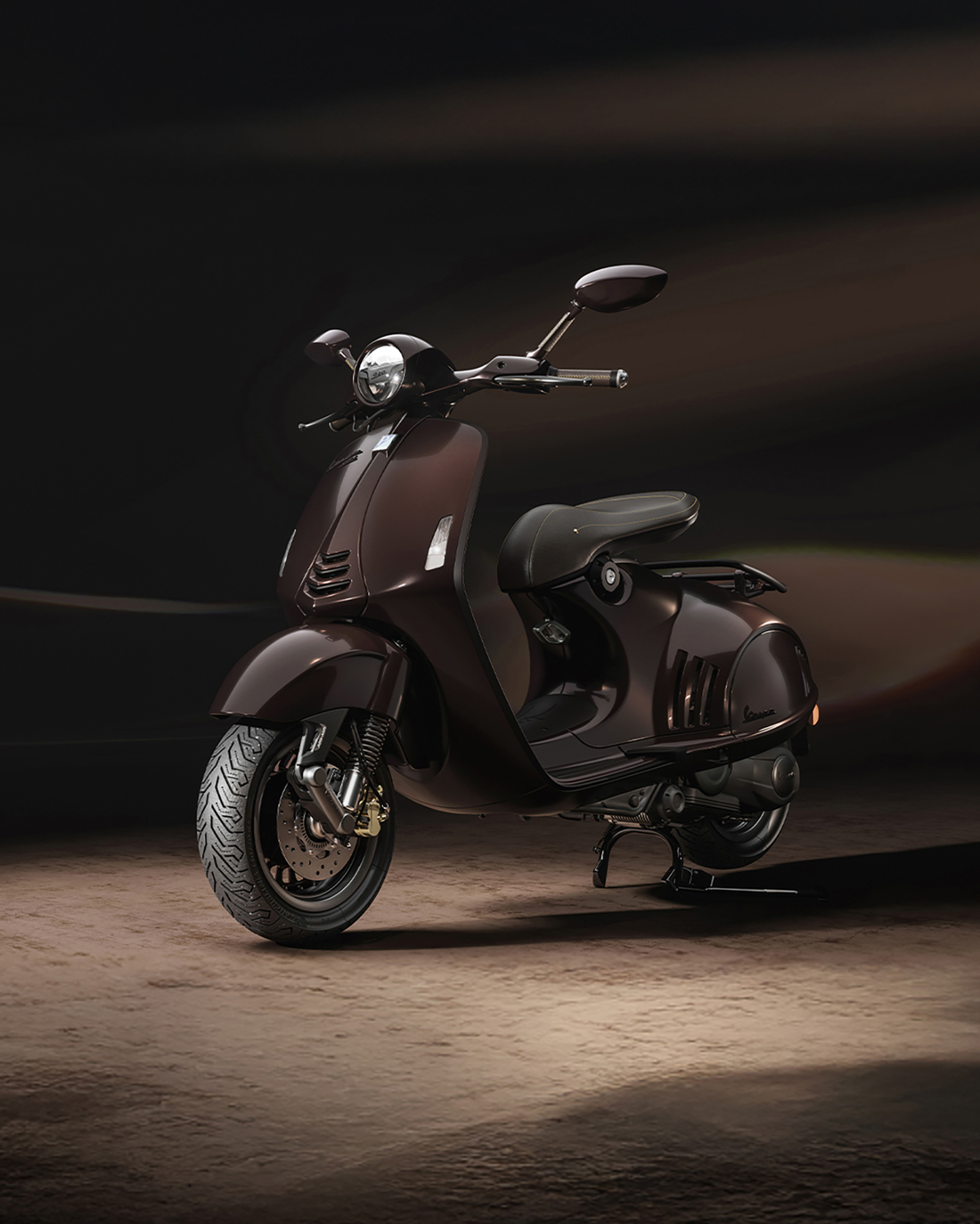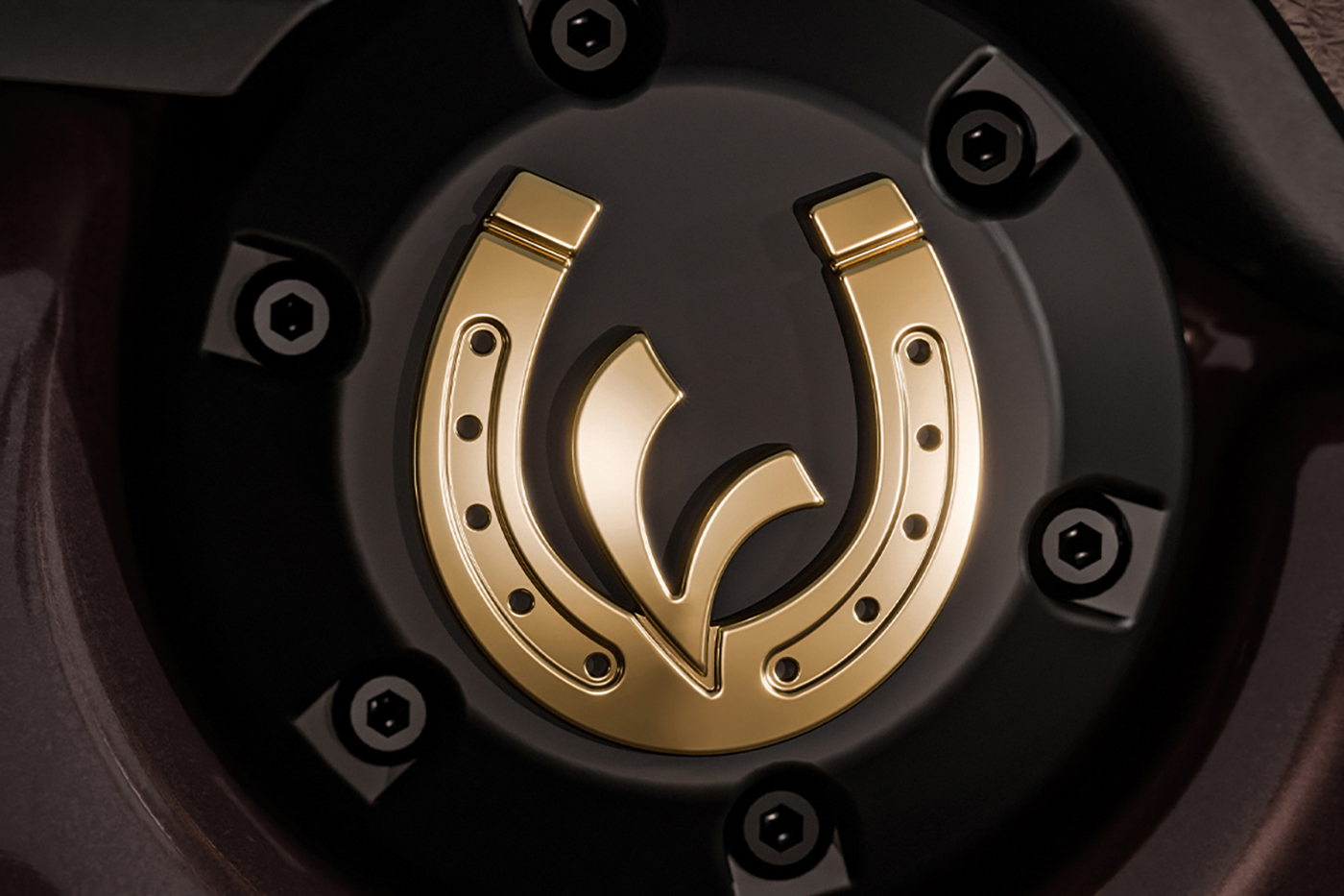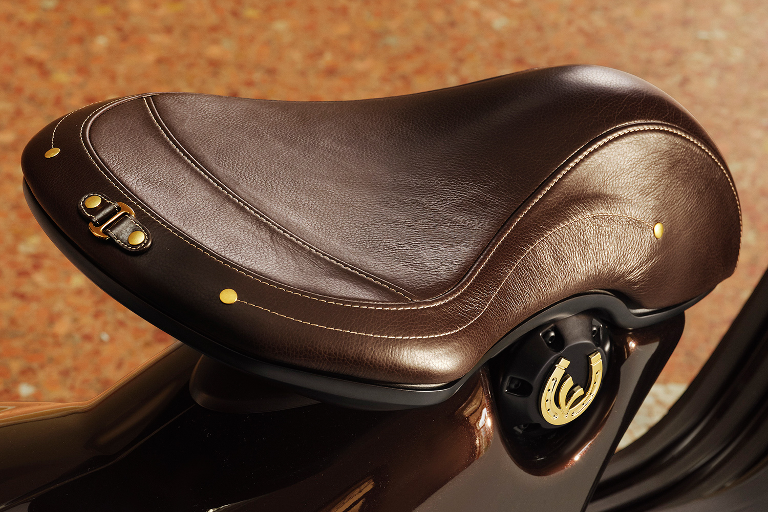 這款限量的特仕版採用獨特的「月桂棕」(Bay color),這深邃的棕色調令人聯想起馬匹深邃且富有光澤的毛色。鋼製車身透過霧面與亮面交錯的細節處理,並點綴精緻的金色飾面,例如座墊下方隱藏著一處珍貴細節:一枚金色的馬蹄鐵,環繞著 Vespa 的「V」字標誌。在手把上,天然皮革與承襲經典的工藝相遇:細緻的菱格紋車縫線由職人精湛手藝勾勒出。這一微小卻足以定義風格的關鍵細節,為騎乘體驗注入最純粹的質感。後視鏡與手把設計相輔相成,在風格與傳統之間取得完美平衡。