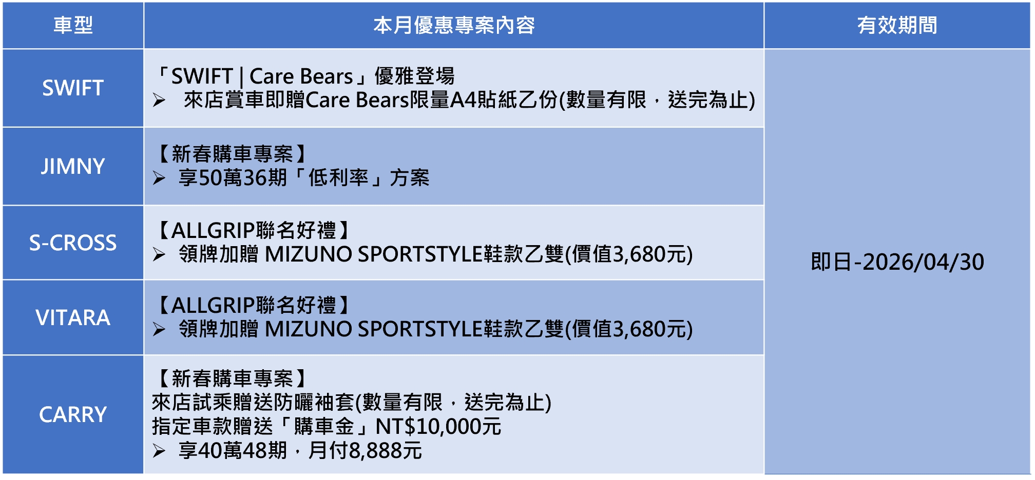 TAIWAN SUZUKI 推出 CARRY 限時促銷專案,於 4 月 1 日至 4 月 30 日期間完成領牌,即贈送購車金 10,000 元,並提供「40 萬 48 期、月付 8,888 元」的專案優惠,協助輕鬆升級工作夥伴。活動期間親臨展示中心試乘 CARRY,更可獲得專屬防曬袖套,數量有限,送完為止。