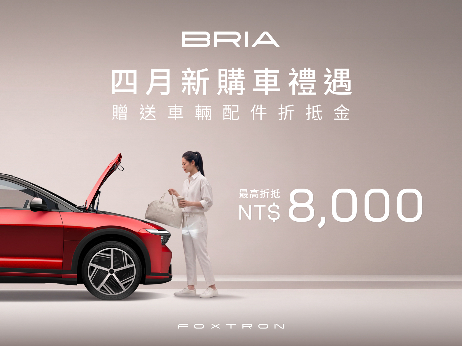 為讓廣大消費者能輕鬆體驗純電生活,Foxtron於四月特別推出專屬購車禮遇。自2026年4月1日起至4月30日止,凡完成下訂Bria Emerge或Pioneer車規,並於當月完成領牌之新車主,即可獲得最高8,000元的車輛配件折抵金(註1),讓準車主們於購車當下即能自由選配實用配件,打造專屬座駕,完善個人化的移動需求。