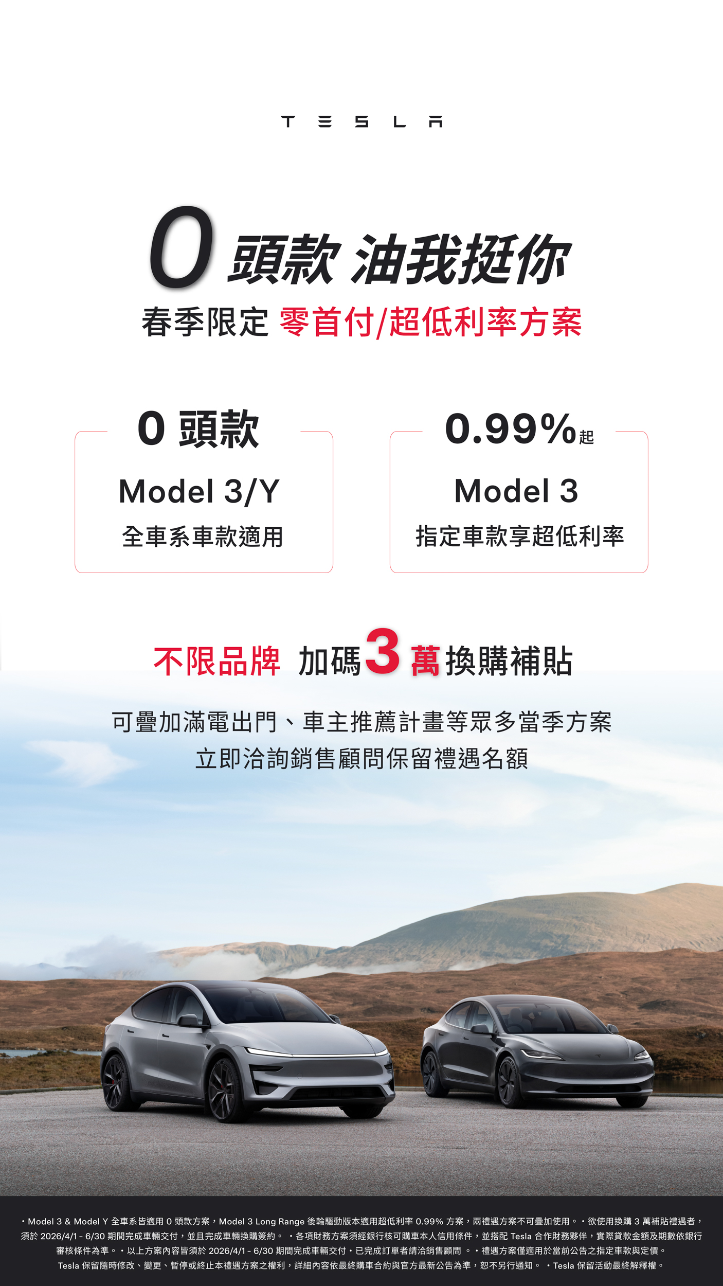 - Model 3 指定車款享 0.99% 超低月付利率方案